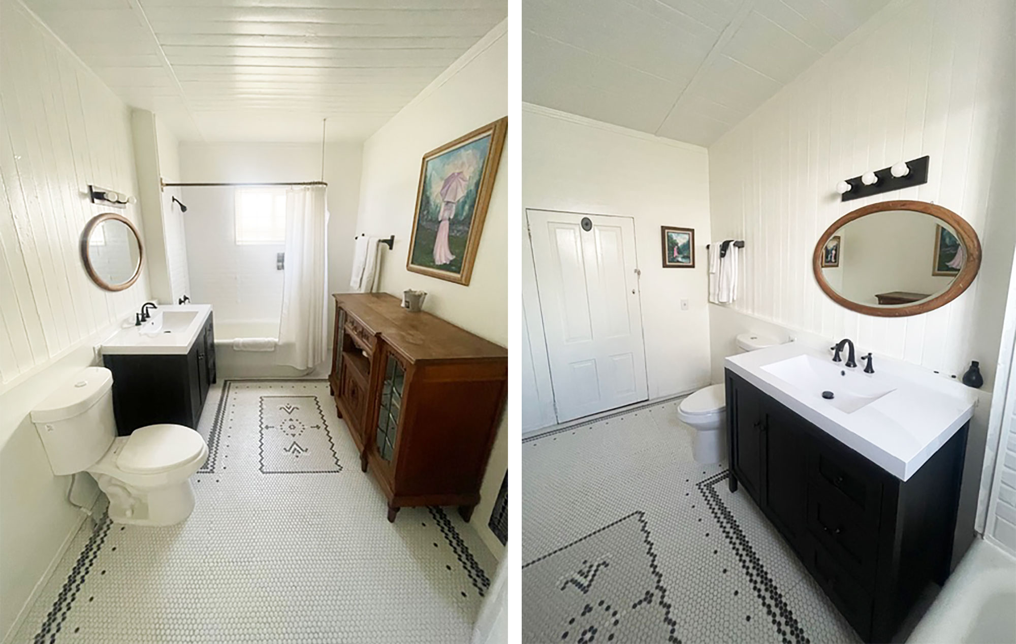 Welcome to the only room in the hotel located on the ground floor in the rear of the hotel. This lovely room has its very own entrance with no other access to it which keeps it very private. One room upon entering and another adjoining which keeps the 2 rooms separated if the guests wish to do so. It has 1 queen bed and 2 twin beds so it accommodates 4 guests comfortably. There is a large bathroom with vintage penny tile floors and a full bathtub & shower. The wall behind the bed has a mural of the trees reminiscent of nearby Twin Lakes.